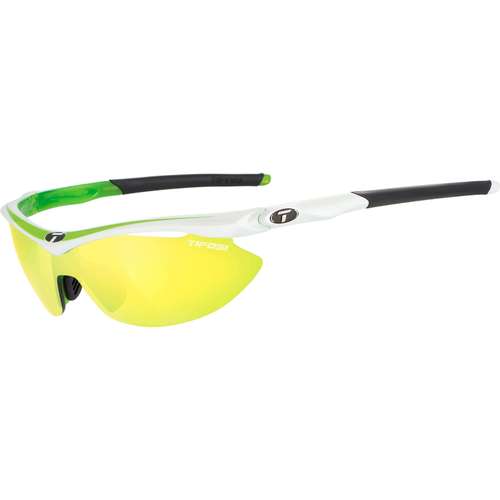 Tifosi bril Slip, kleur: wit/groen (race neon) Sterk TR-90 frame, anti-slip rubber op de neusvleugel en verstelbare pootjes. Standaard geleverd met 3 verwisselbare en geventileerde sets glazen. Smoke: ideaal tijdens zonnige omstandigheden. AC red: te gebruiken van zonnig tot bewolkt weer. Clear (helder): aan te bevelen in bewolkt, donker weer.