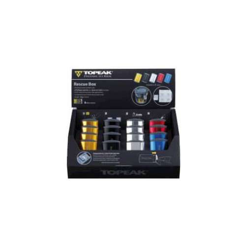 Topeak Rescue box in display 16st , 4x zwart- 4x zilver- 4x goud- 2x blauw- 2x rood, inhoud box – zelfklevende plakkers/ pleisters, schuurpapier, box is waterdichtTRB02